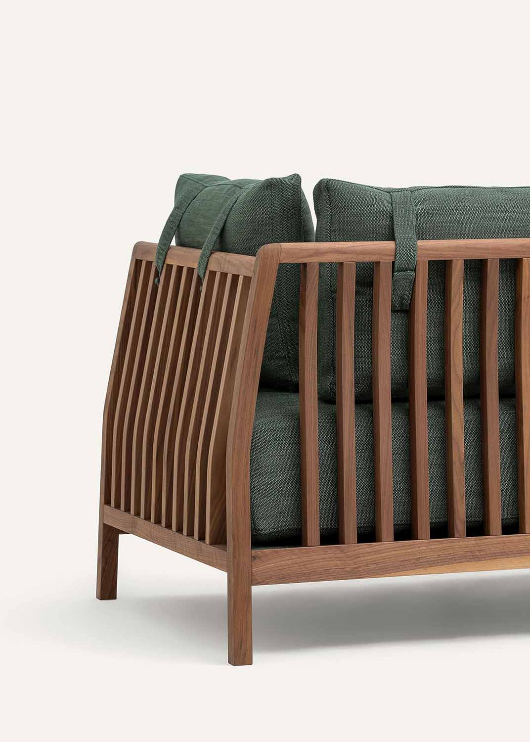 Bacchetta is a comfortable seat that embraces the forms of the body with its cushions made of various layers of foam rubber and invites you to relax. The wooden rods of the structure are a design element that is often used in the architectures of the Circle to create an effect of transparency and lightness. The structure is made of wood, untreated so the value of the patina that passing time creates on the surfaces is appreciated. The cushions are covered in fireproof patterned fabric available in the colours blue, petroleum green, lime green, orange and beige. Bacchetta is made in the one-, two- and three-seater versions.